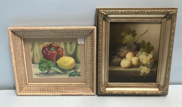 Framed painting on canvas on still life, signed Gray 11"h., 13"w., and still life painting of fruits on glass 14"h., 12"w. Framed painting on canvas on still life, signed Gray 11"h., 13"w., and still life painting of fruits on glass 14"h., 12"w.