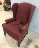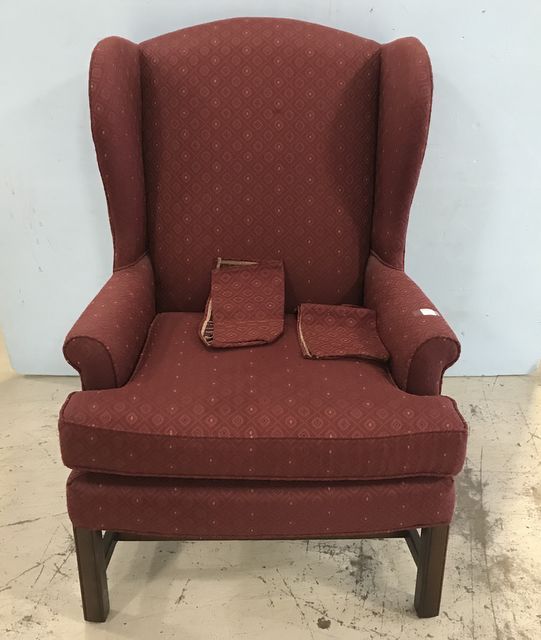 Don Kazery's Collection Wing Back Chair, maroon upholstery, arm chair, with arm covers, 41"h. Don Kazery's Collection Wing Back Chair, maroon upholstery, arm chair, with arm covers, 41"h.
