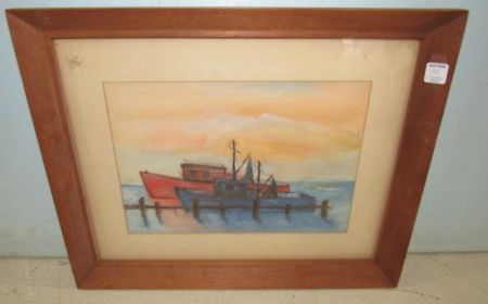 Framed watercolor of ship on dock, 17"h., 21"h. Framed watercolor of ship on dock, 17"h., 21"h.