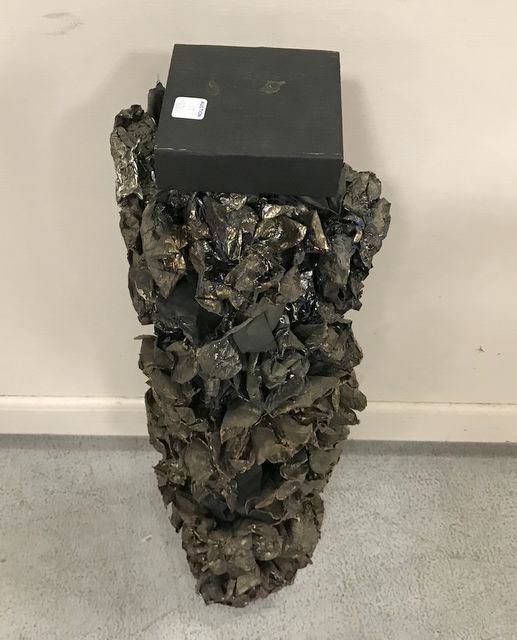 Decorative stand with wrapped floral design decor, wood pedestal, 36"h. Decorative stand with wrapped floral design decor, wood pedestal, 36"h.