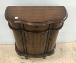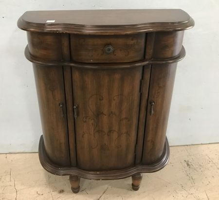 Kirkland's Inc. Wall Demi Lune Cabinet, walnut finish, three door, one drawer, has few nicks, 30"h., 26"w., 12"d. Kirkland's Inc. Wall Demi Lune Cabinet, walnut finish, three door, one drawer, has few nicks, 30"h., 26"w., 12"d.