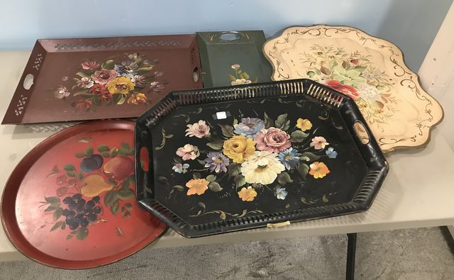 Six assorted sized handled metal trays, hand painted flower artwork, some have wear. Six assorted sized handled metal trays, hand painted flower artwork, some have wear.