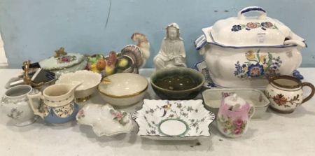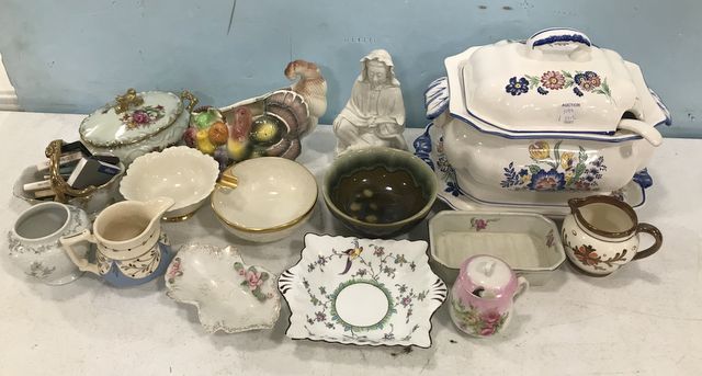 Chinese figurine, Dickson ceramic turkey planter, Staffordshire bowl, glazed pottery bowl, small Lefton dish, Lenox ashtray, Lenox bowl, two sugars and creamers, French Banquet covered jar, hand painted basket, blue and white ceramic tureen set. Chinese figurine, Dickson ceramic turkey planter, Staffordshire bowl, glazed pottery bowl, small Lefton dish, Lenox ashtray, Lenox bowl, two sugars and creamers, French Banquet covered jar, hand painted basket, blue and white ceramic tureen set.