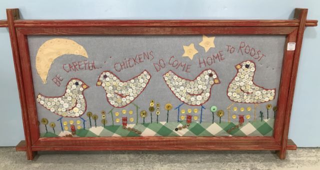 1206 Framed Needlepoint Artwork "Chicken's Do Come Home to Roost"