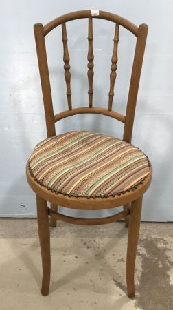 Antique bent wood side chair with cane bottom missing, replaced with cushion seat, primitive style, 35"h. Antique bent wood side chair with cane bottom missing, replaced with cushion seat, primitive style, 35"h.