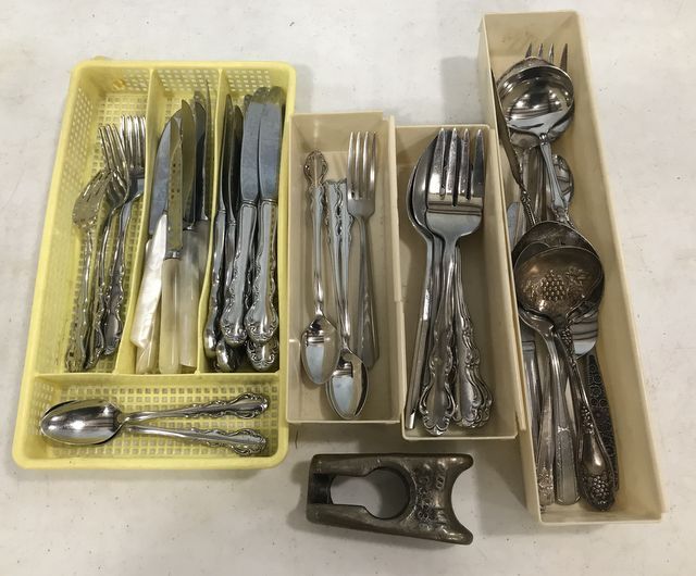 Forks, spoons, tea spoons, soup spoons, butter knives, Kalmar mother of pearl style stainless knives, meat forks. Forks, spoons, tea spoons, soup spoons, butter knives, Kalmar mother of pearl style stainless knives, meat forks.