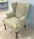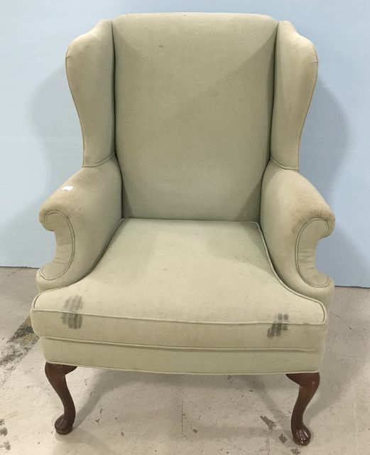 Upholstered Queen Anne wing back arm chair, fabric is dirty, needs cleaning, 42"h. Upholstered Queen Anne wing back arm chair, fabric is dirty, needs cleaning, 42"h.