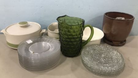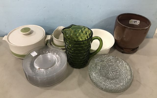 14 clear glass salad plates, Green White Hall pitcher, Spring collection stoneware, glazed pottery planter. 14 clear glass salad plates, Green White Hall pitcher, Spring collection stoneware, glazed pottery planter.