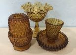 Fenton hobnail glass compote 6"h., Indiana Glass diamond point glass candle lamp, and compote. Fenton hobnail glass compote 6"h., Indiana Glass diamond point glass candle lamp, and compote.