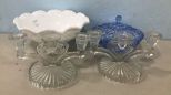 Milk glass compote bowl 5"h., 10"dia., vintage pressed glass two arm candle holder, light blue pressed glass covered dish. Milk glass compote bowl 5"h., 10"dia., vintage pressed glass two arm candle holder, light blue pressed glass covered dish.
