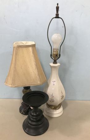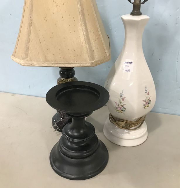1262 White Ceramic Floral Design Table Lamp, Tortoise style Lamp, and Candleholder