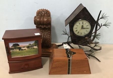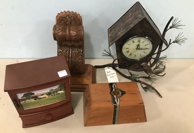 1274 Modern Bird House Clock, Wood Carved Wall Shelf, Jewelry Box, and Cigar Box