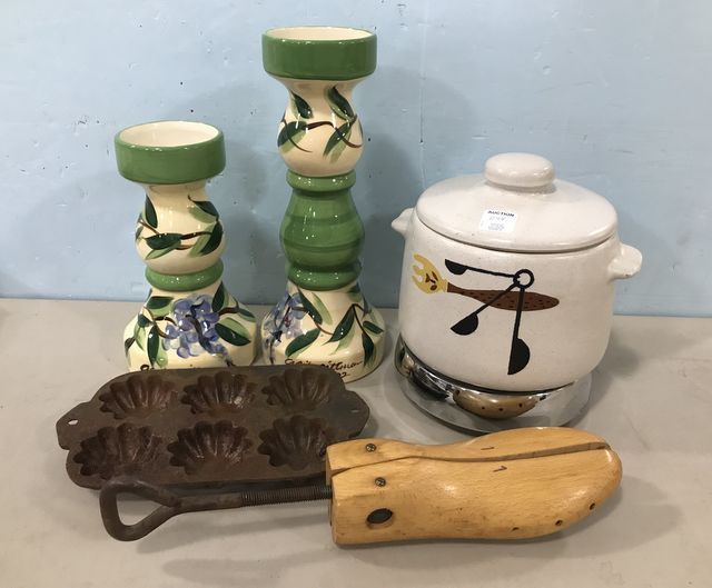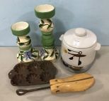 1284 Gail Pittman Vase, Shoe Horn, Iron Muffin Pan, and Stoneware Pot