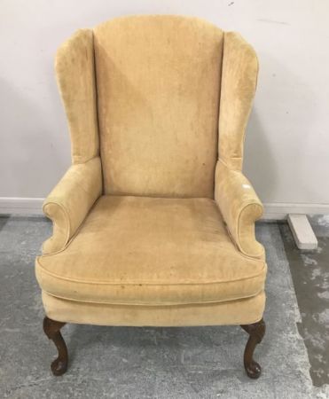 Upholstered Queen Anne Style wing back arm chair, fabric is dirty, 43"h. Upholstered Queen Anne Style wing back arm chair, fabric is dirty, 43"h.