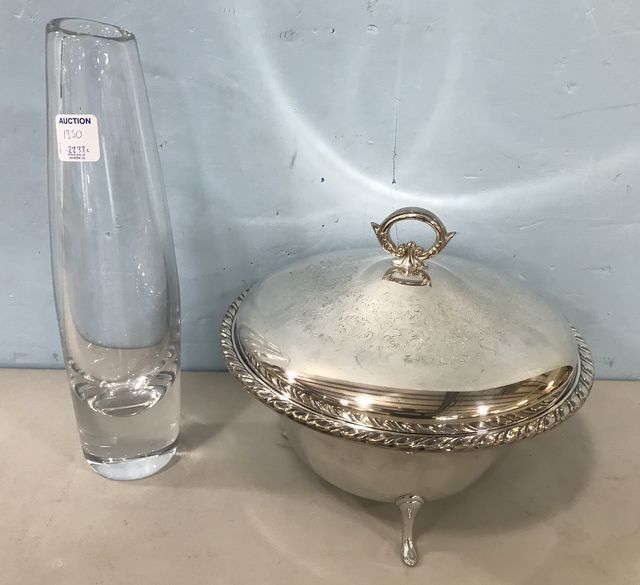 Signed Orefors glass flute 11"h., WM Rogers silver plated covered footed dish. Signed Orefors glass flute 11"h., WM Rogers silver plated covered footed dish.