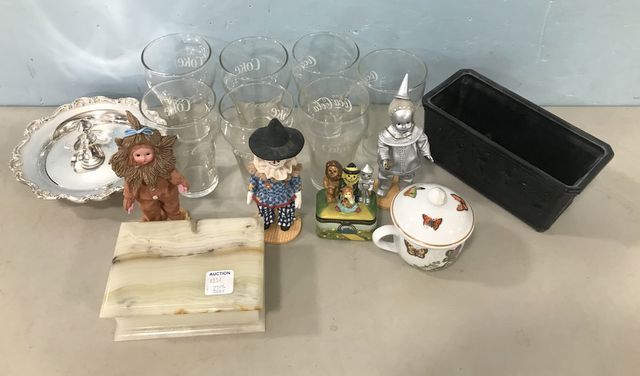 Seven Coke Cola Glasses, onyx trinket box, Wizard of Oz figurines, hand painted porcelain cup, Gorham silverplated dish, Grecian black glass planter. Seven Coke Cola Glasses, onyx trinket box, Wizard of Oz figurines, hand painted porcelain cup, Gorham silverplated dish, Grecian black glass planter.
