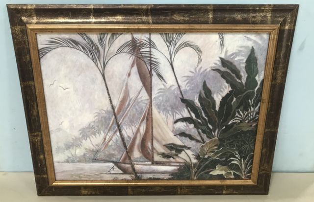 Sailboat giclee print painting on board, framed, 23"h., 29"w. Sailboat giclee print painting on board, framed, 23"h., 29"w.
