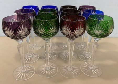 12 Color Cut To Clear Stems, black, blue, red, purple, etched, good condition, 8 1/2"h. 12 Color Cut To Clear Stems, black, blue, red, purple, etched, good condition, 8 1/2"h.
