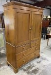 New English Style Primitive Cabinet, two piece, base with drawers, one weak foot, top is converted for TV, double door, some scratches on finish, 77"h., 48"w., 21"d. New English Style Primitive Cabinet, two piece, base with drawers, one weak foot, top is converted for TV, double door, some scratches on finish, 77"h., 48"w., 21"d.