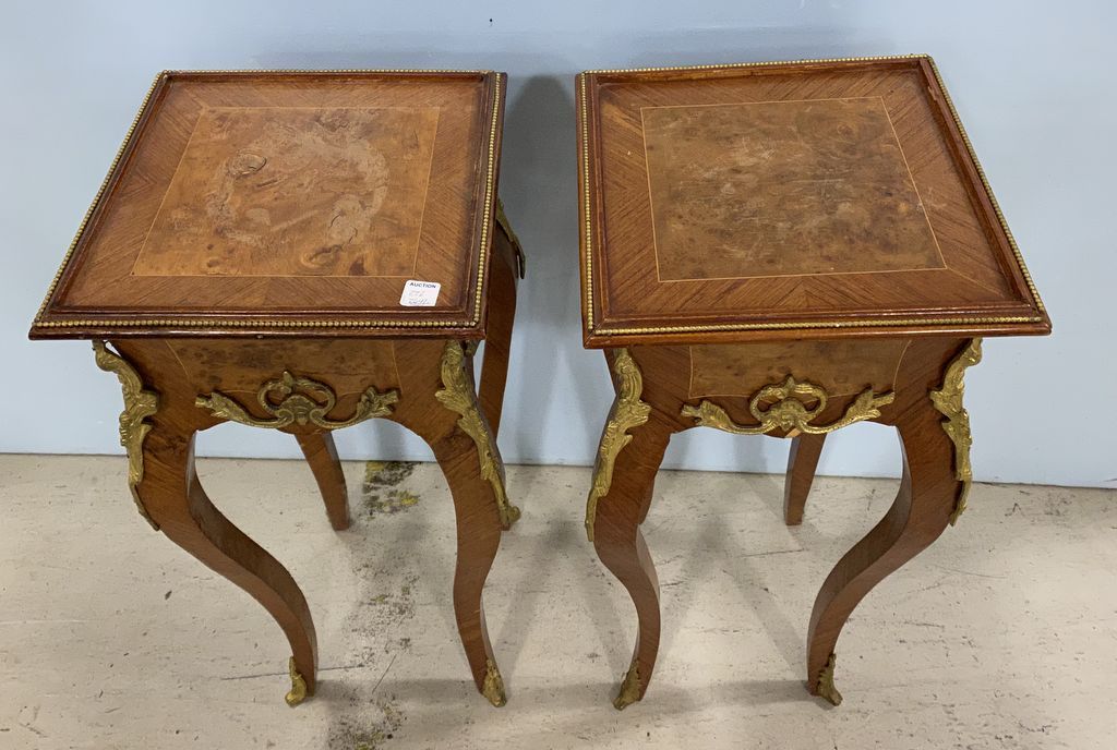 Pair of French Empire Side Tables, square tops, brass ormolu, some veneer buckling and chips, tops have round wear from plant vases, 30"h., 13"w. Pair of French Empire Side Tables, square tops, brass ormolu, some veneer buckling and chips, tops have round wear from plant vases, 30"h., 13"w.