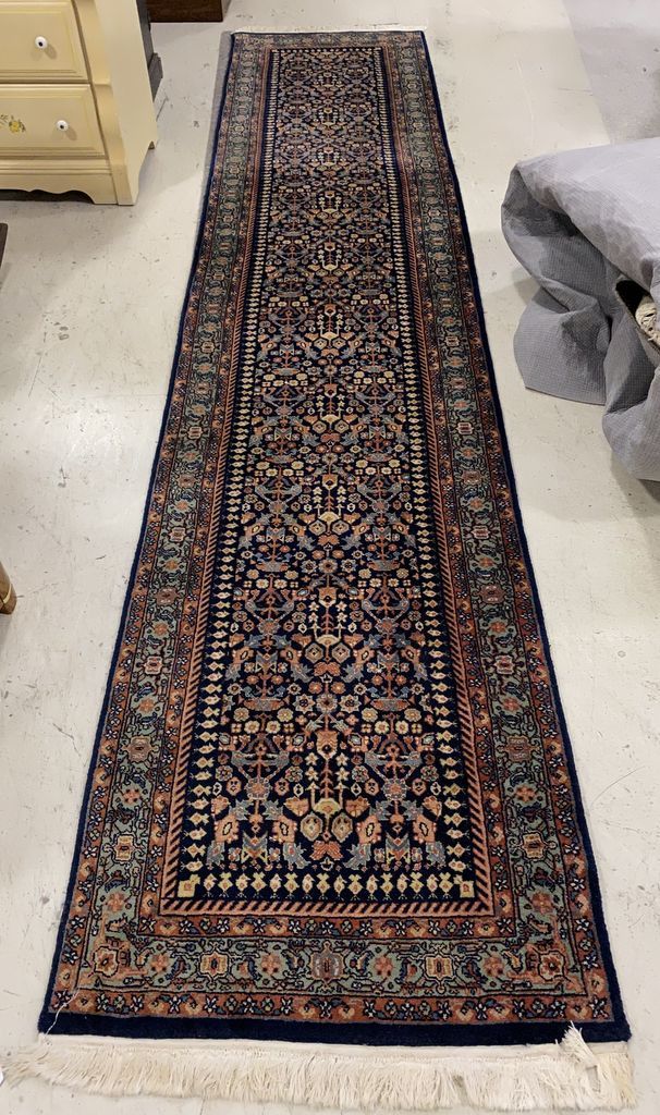 Tinnin Carpets Woven Runner 2'6 x 12', hand woven, very good condition, navy blue. Tinnin Carpets Woven Runner 2'6 x 12', hand woven, very good condition, navy blue.