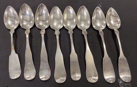 8 Coin Silver Spoons, two monogrammed, light wear. 8 Coin Silver Spoons, two monogrammed, light wear.