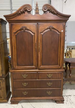 Antique Reproduction Cherry Entertainment Armoire, two pieces, double door, four drawers, light wear, 88"h., 47"w., 24"d, one door clamp needs work. Antique Reproduction Cherry Entertainment Armoire, two pieces, double door, four drawers, light wear, 88"h., 47"w., 24"d, one door clamp needs work.