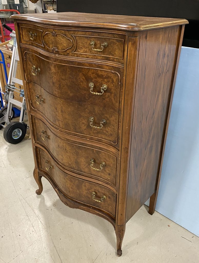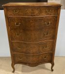 Burl Mahogany Bowfront Chest of Drawers, French Style, brass pulls, has some veneer chips, light wear, good condition, 54"h., 35"w., 21"d. Burl Mahogany Bowfront Chest of Drawers, French Style, brass pulls, has some veneer chips, light wear, good condition, 54"h., 35"w., 21"d.