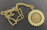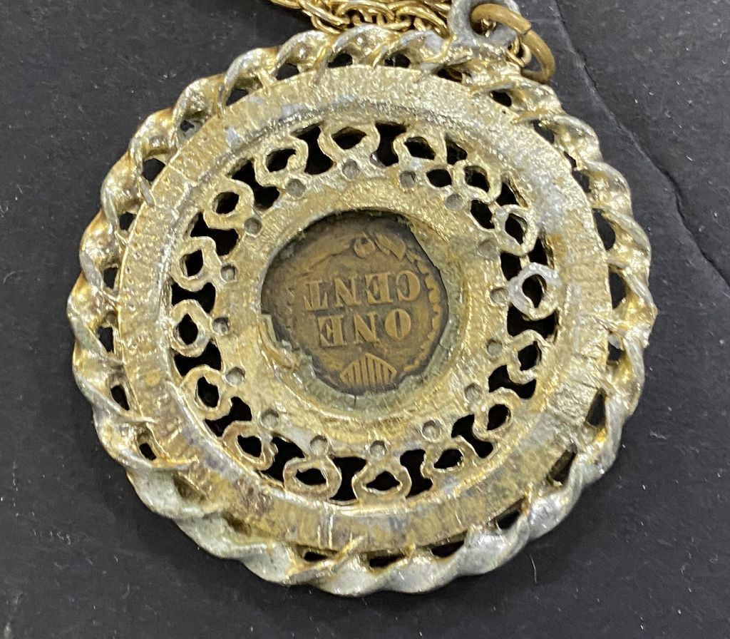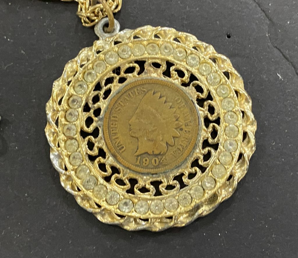 1904 Indian Head Penny Necklace, gold tone necklace and bezel, some wear on bezel. 1904 Indian Head Penny Necklace, gold tone necklace and bezel, some wear on bezel.