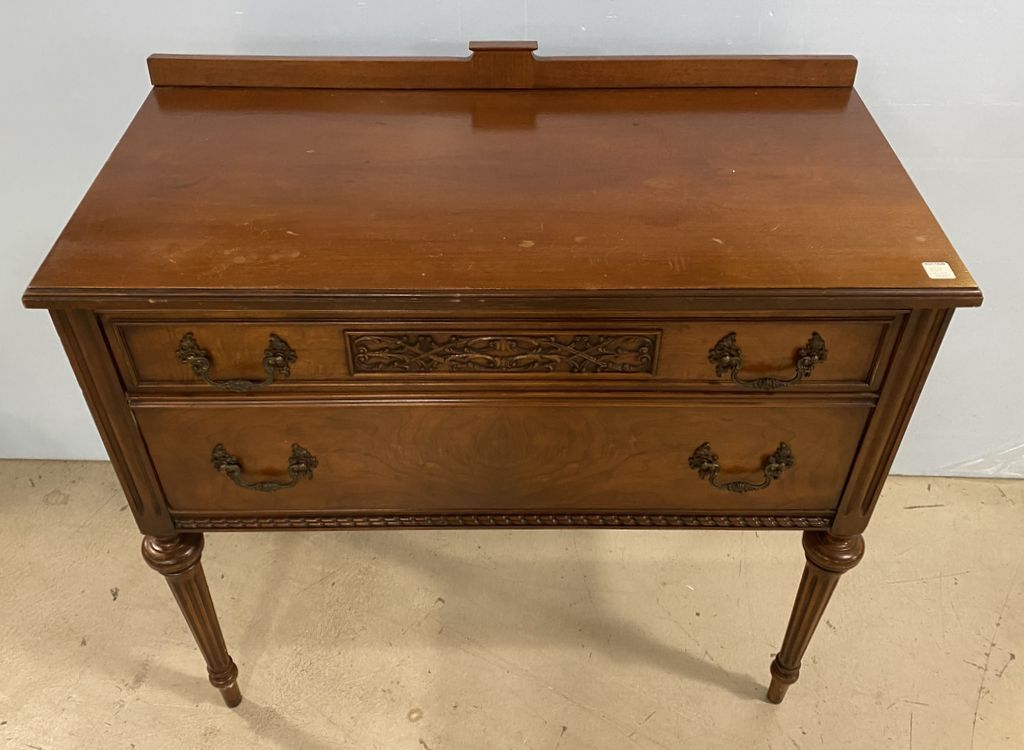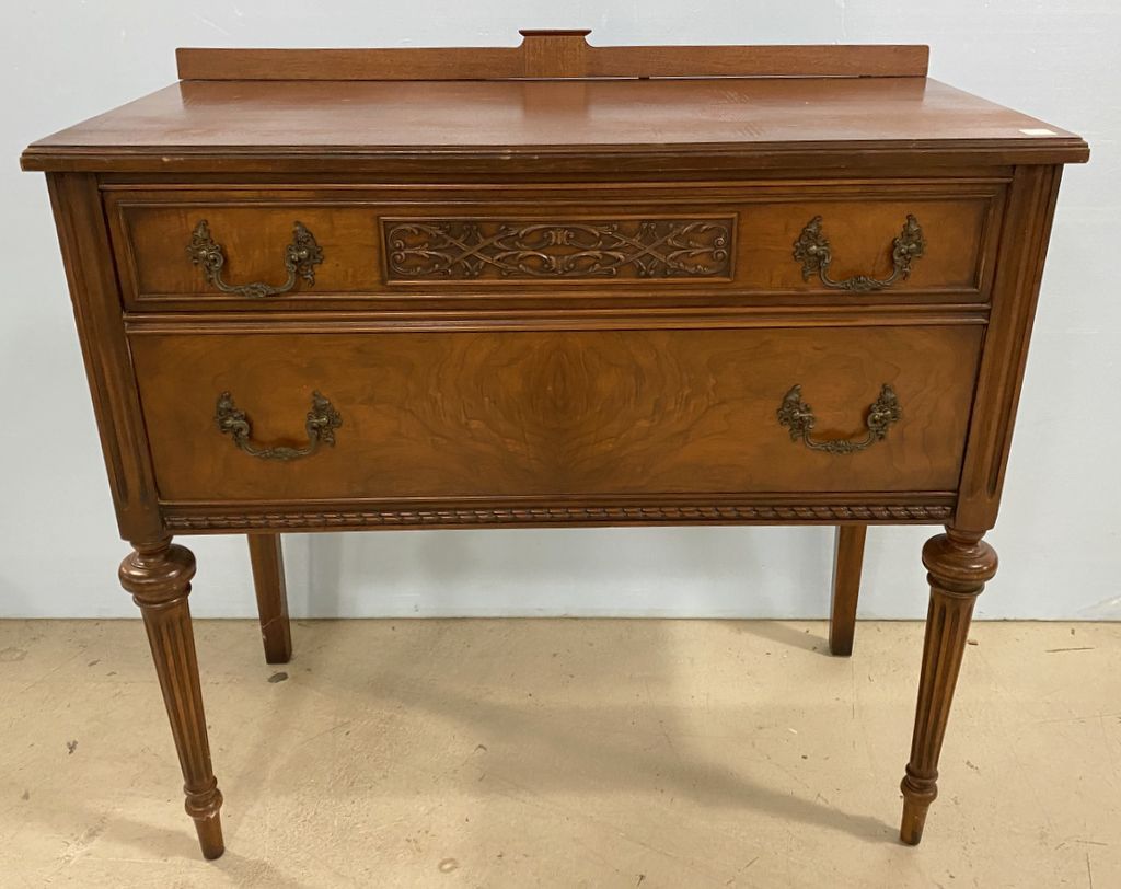 French Provincial Vintage Server, two drawers, burl mahogany, has light wear, 36"h., 36"w., 17'd. French Provincial Vintage Server, two drawers, burl mahogany, has light wear, 36"h., 36"w., 17'd.