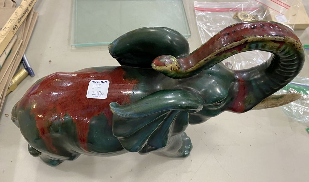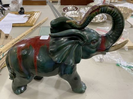 Hand Crafted Ceramic Elephant, glazed, painted, good condition, 13"h., 16"w. Hand Crafted Ceramic Elephant, glazed, painted, good condition, 13"h., 16"w.