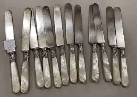 A.J. Jordan St. Louis Butter Knives, mother of pearl handled, 12 total, sterling band on handle. A.J. Jordan St. Louis Butter Knives, mother of pearl handled, 12 total, sterling band on handle.