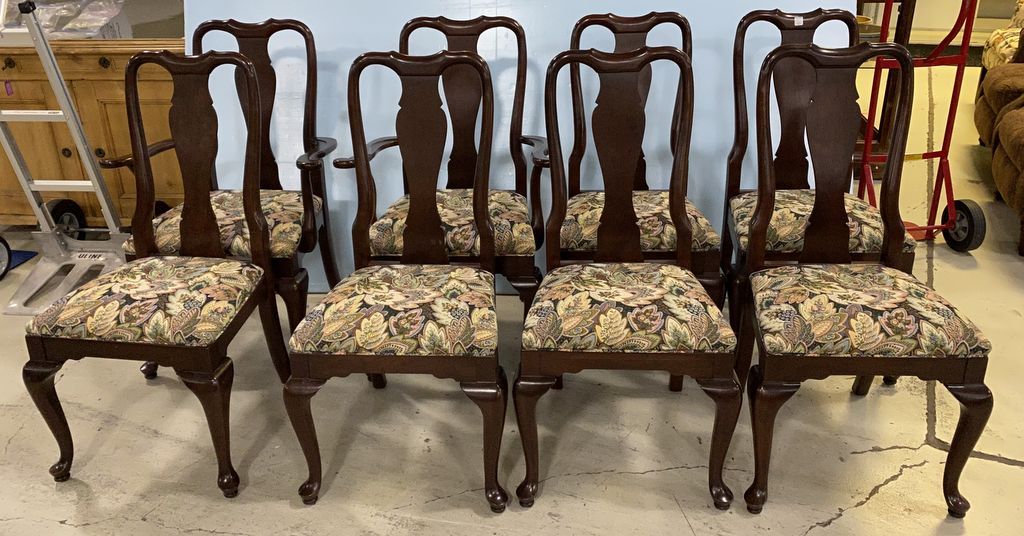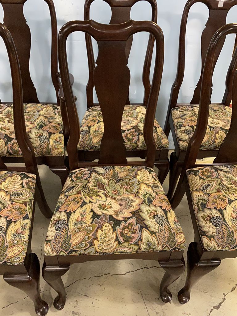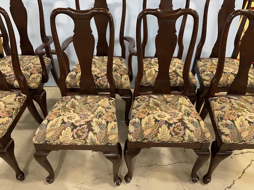 Eight Cherry Ethan Allen Dining Chairs, Queen Anne Style, floral upholstery cushions, good condition. two arm, six sides. Eight Cherry Ethan Allen Dining Chairs, Queen Anne Style, floral upholstery cushions, good condition. two arm, six sides.