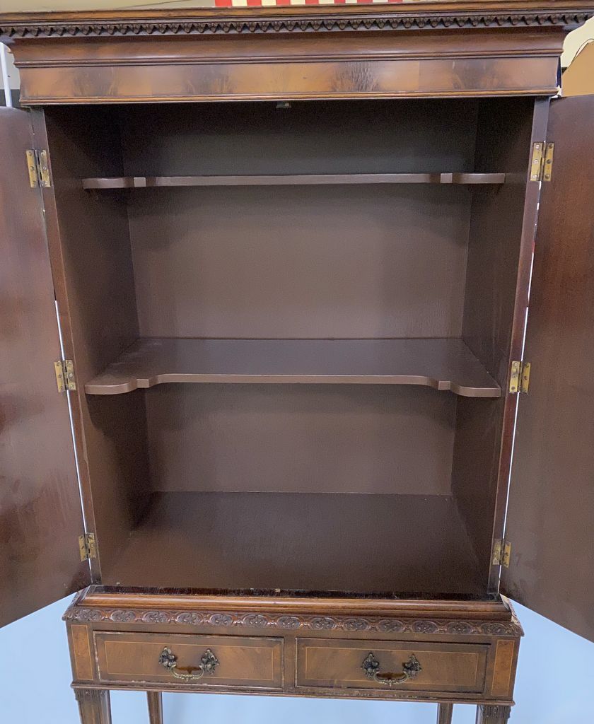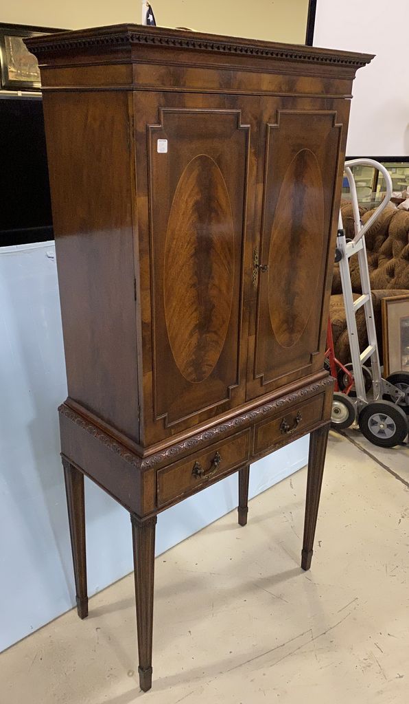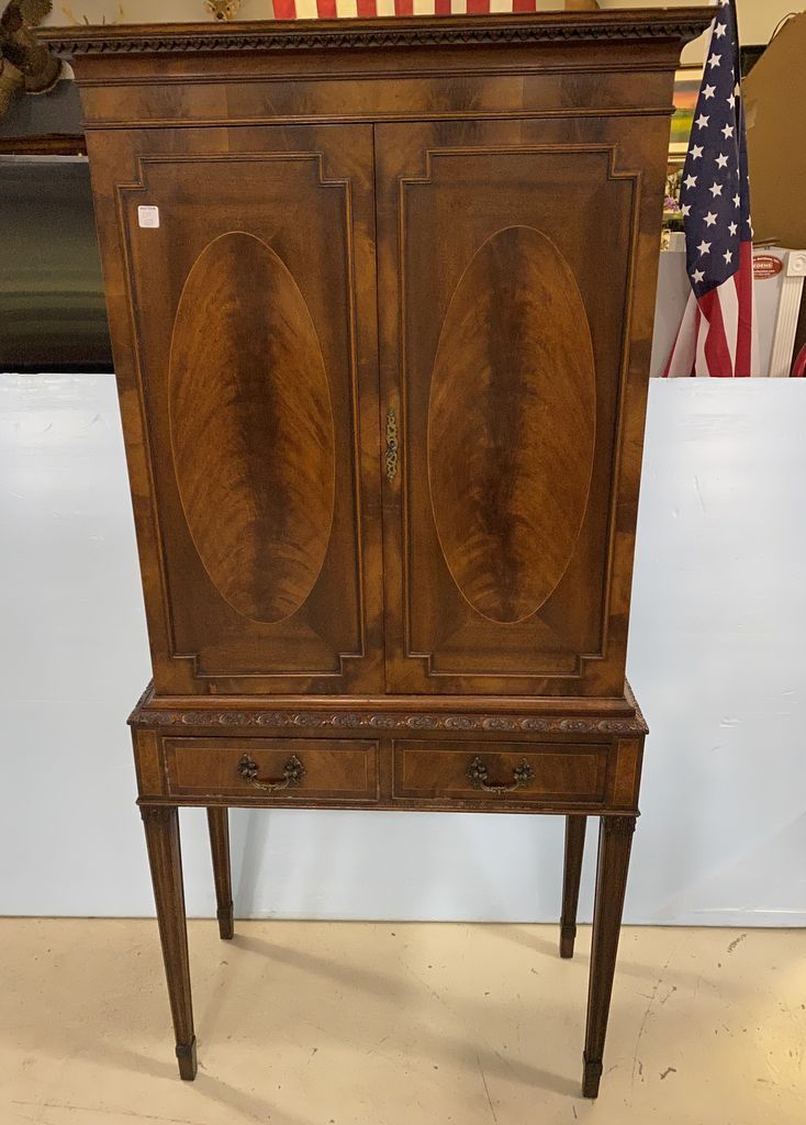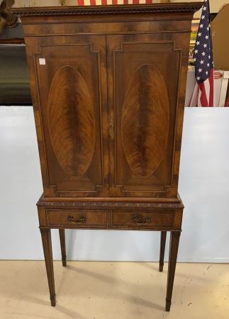 French Style Mahogany Cabinet, antique reproduction, two shelves, double door with inlaid trim, two piece, two drawers in base, good condition, 67"h., 31"w.,17"d. French Style Mahogany Cabinet, antique reproduction, two shelves, double door with inlaid trim, two piece, two drawers in base, good condition, 67"h., 31"w.,17"d.