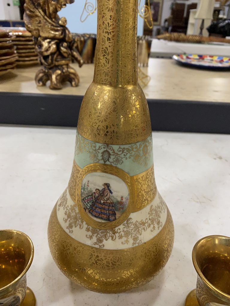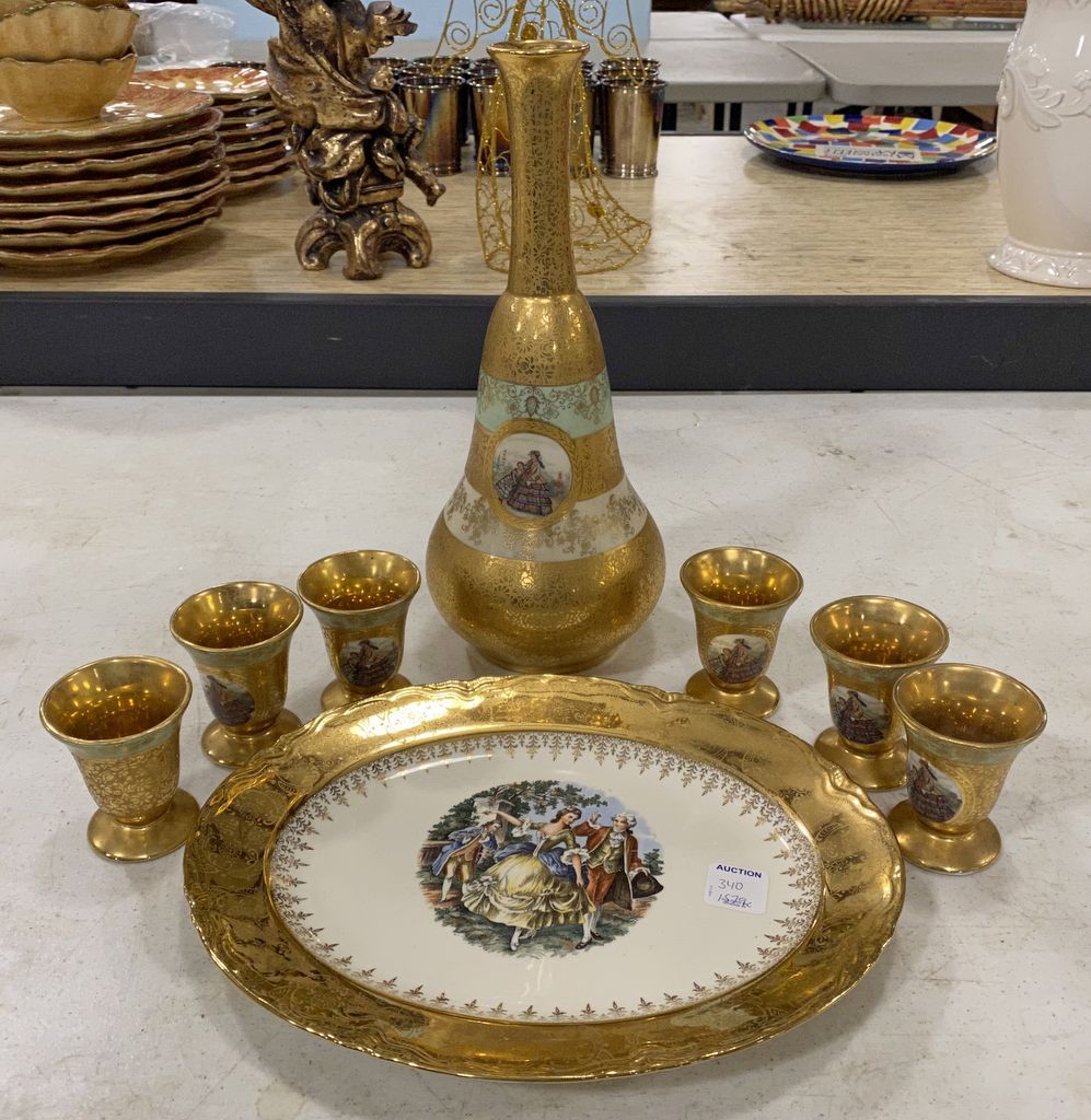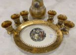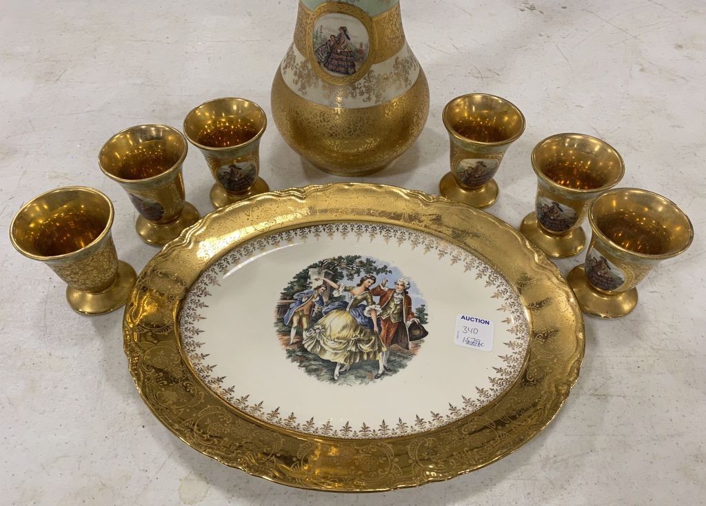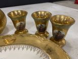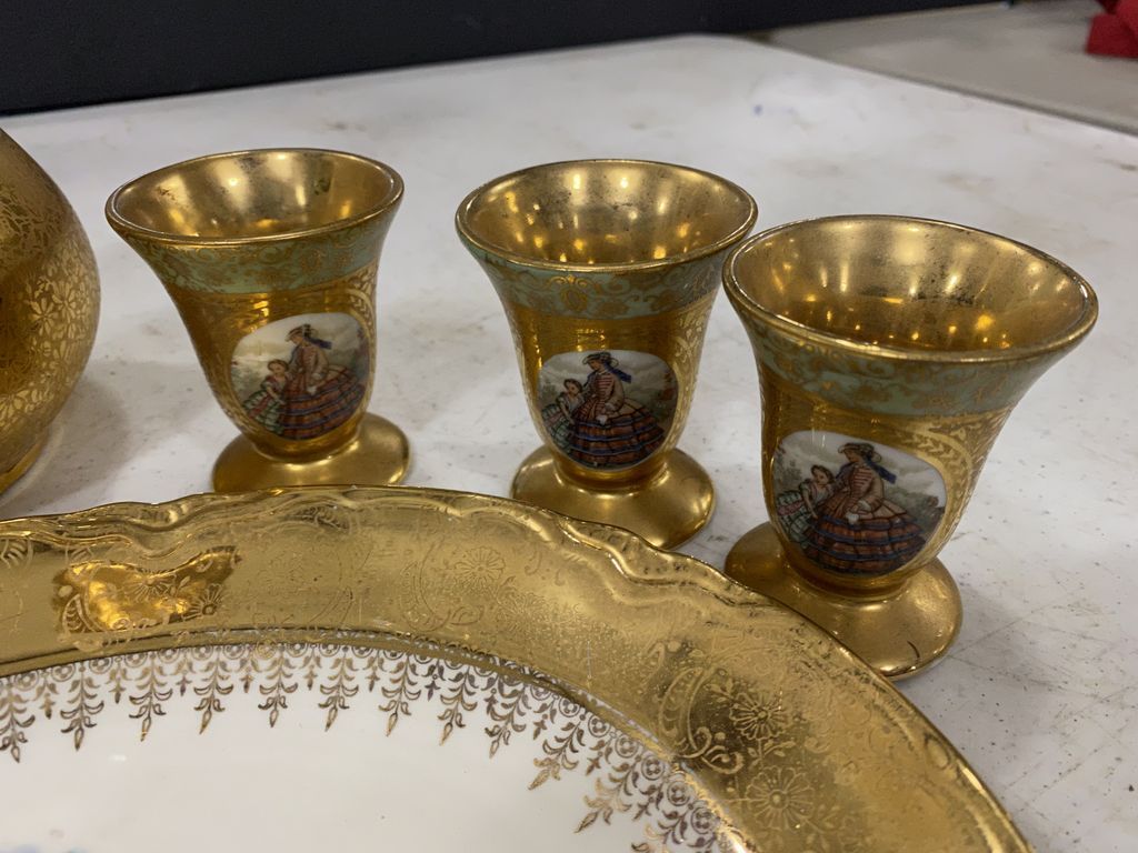 LeMieux China 24 Karat Gold Porcelain Set, hand painted, decanter 12"h., 6 cups, and platter. LeMieux China 24 Karat Gold Porcelain Set, hand painted, decanter 12"h., 6 cups, and platter.