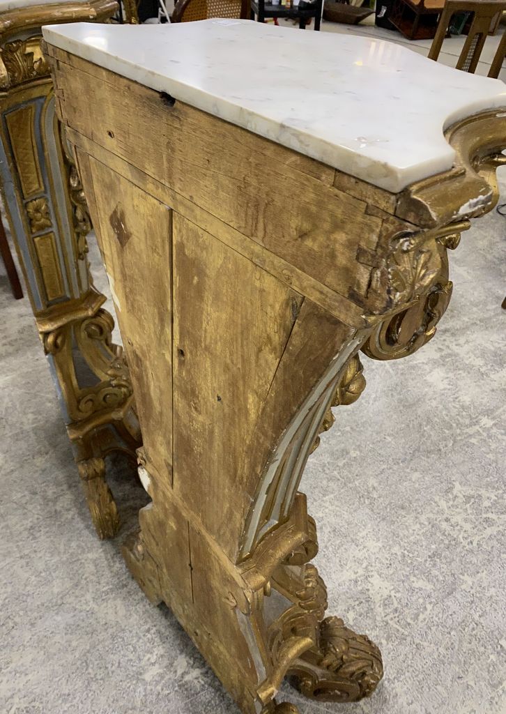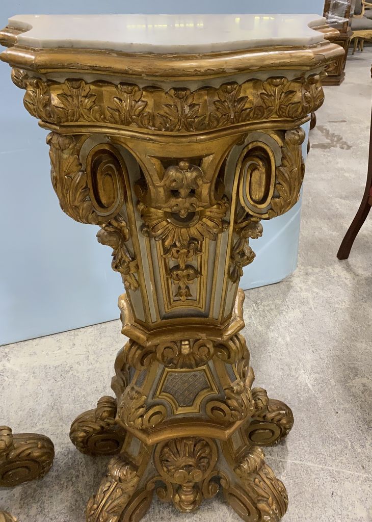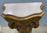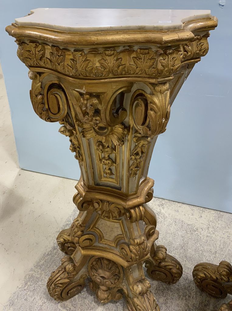 Pair of Italian Gold Gilt Pedestals, wood, carved, hand painted, white marble tops, 47"h., 21"w., 12"d. Pair of Italian Gold Gilt Pedestals, wood, carved, hand painted, white marble tops, 47"h., 21"w., 12"d.