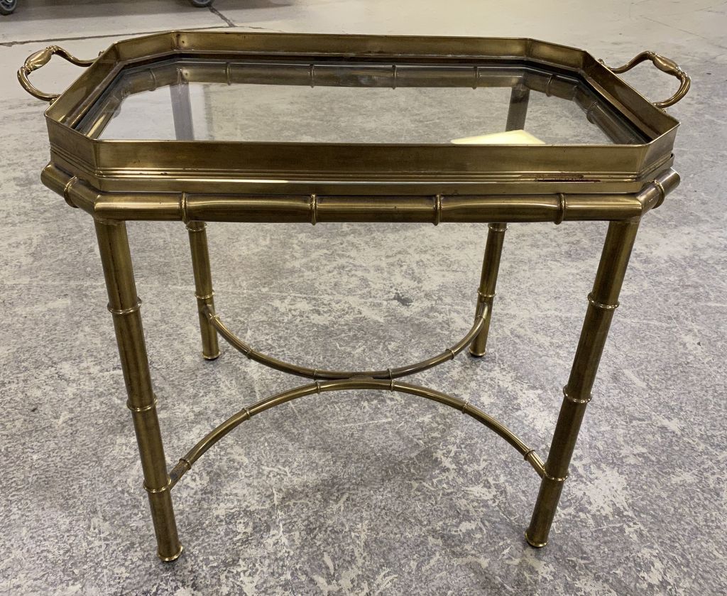 Brass Serving Table, contemporary, table has glass top, tray is missing glass, 21"h., 26"w. Brass Serving Table, contemporary, table has glass top, tray is missing glass, 21"h., 26"w.