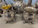 BSC Silver on Copper Tea Set, Coffee pitchers, creamer, sugar, waste, sterling silver border, chase by hand, made in English, has tarnish and wear. BSC Silver on Copper Tea Set, Coffee pitchers, creamer, sugar, waste, sterling silver border, chase by hand, made in English, has tarnish and wear.