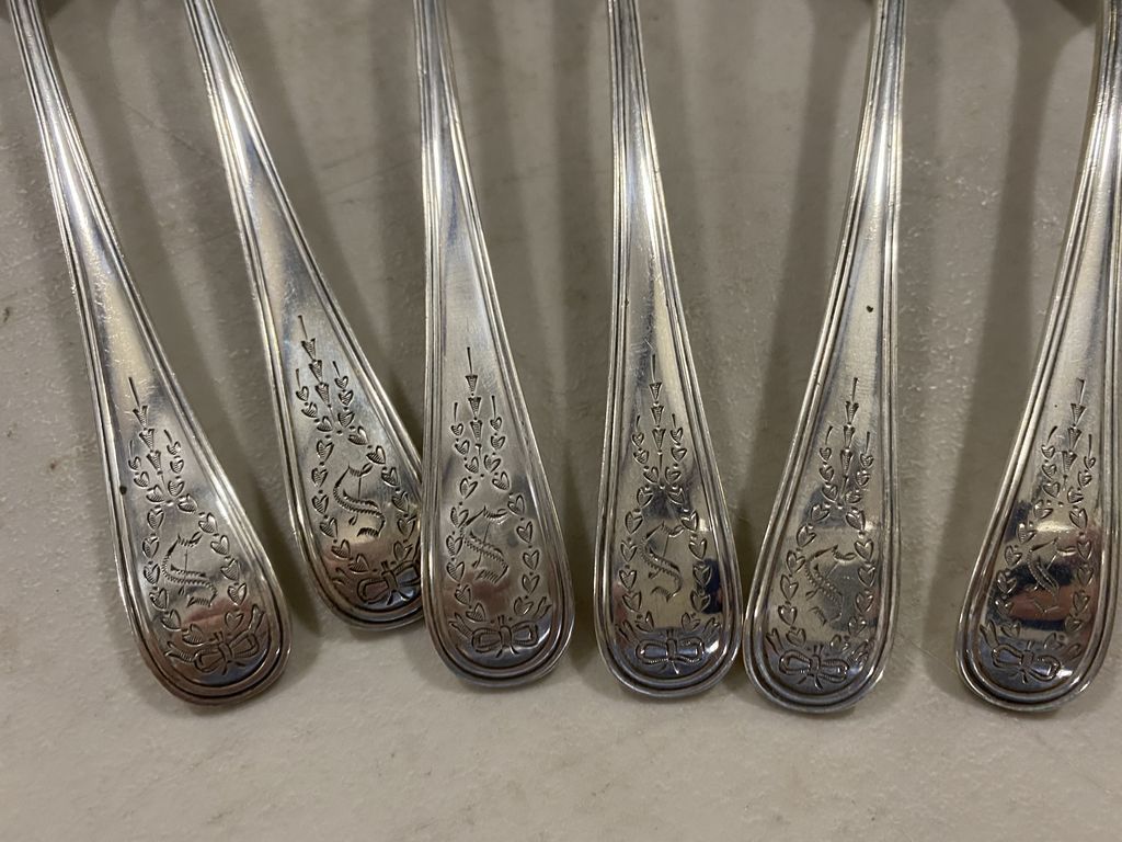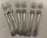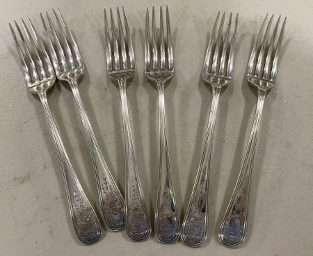 Six Sterling Dinner Forks, lion and anchor mark, monogrammed. Six Sterling Dinner Forks, lion and anchor mark, monogrammed.
