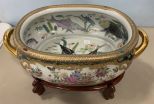Chinese Satsuma Style Center Piece Bowl, porcelain, on wood stand, fish bowl, handled, gold gilt, 6"h., 18"w. Chinese Satsuma Style Center Piece Bowl, porcelain, on wood stand, fish bowl, handled, gold gilt, 6"h., 18"w.