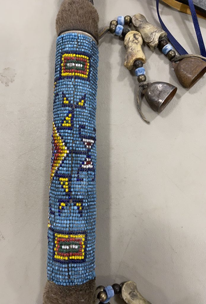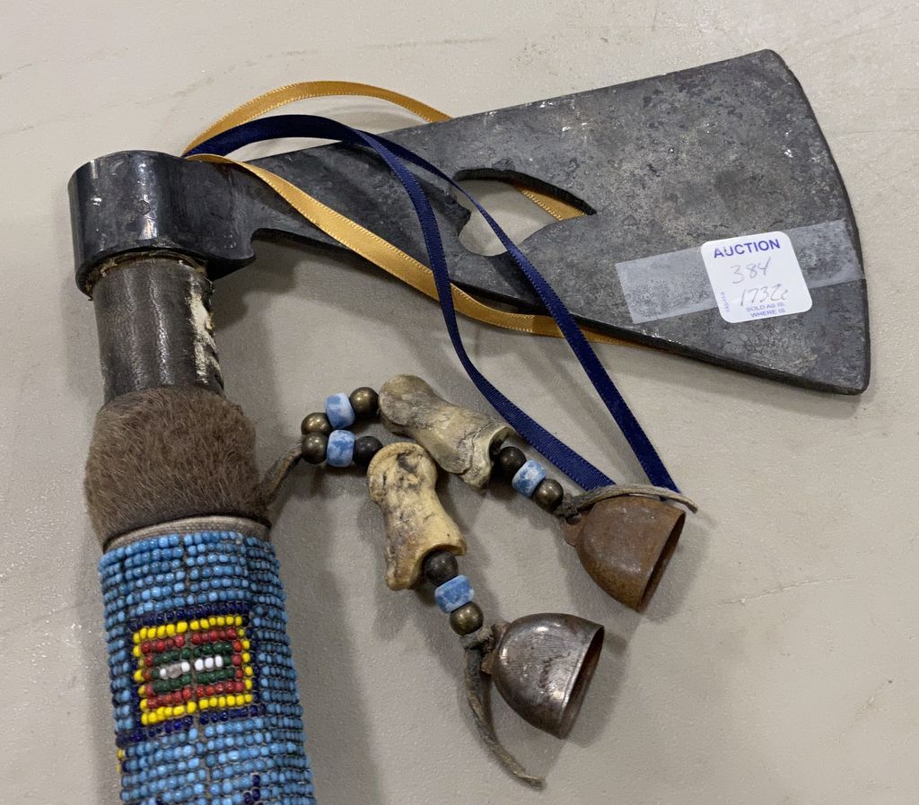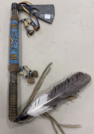 Replica Native American Tomahawk, vintage, metal blade, beaded design, bells, and feathers, hide cover, 20" Replica Native American Tomahawk, vintage, metal blade, beaded design, bells, and feathers, hide cover, 20"