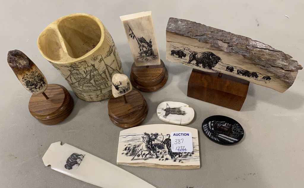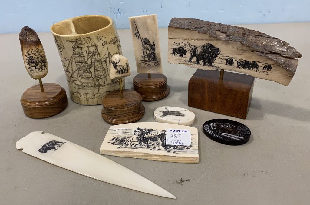 Decorative Native American Etchings and Ship Etchings, bone and plastic pieces. Decorative Native American Etchings and Ship Etchings, bone and plastic pieces.