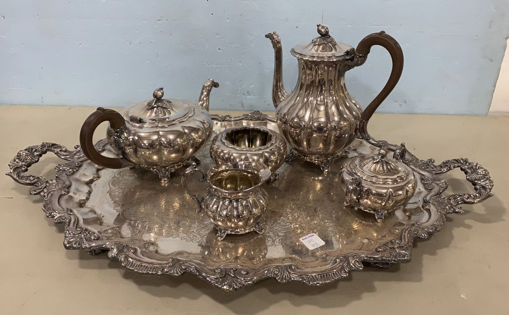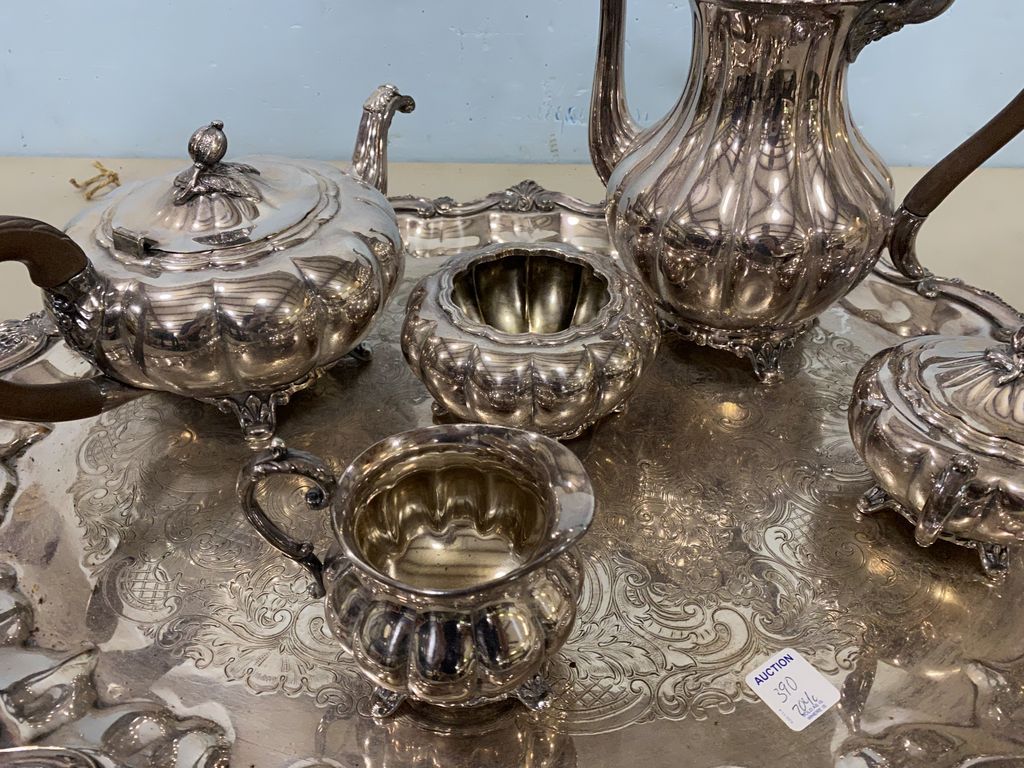 Silver Plated Coffee/Tea Service, Melon Plated Sheffield with Tray, Water, Coffee, waste, sugar, creamer, and serving tray, water pitcher missing lid pin, has been cleaning. Silver Plated Coffee/Tea Service, Melon Plated Sheffield with Tray, Water, Coffee, waste, sugar, creamer, and serving tray, water pitcher missing lid pin, has been cleaning.