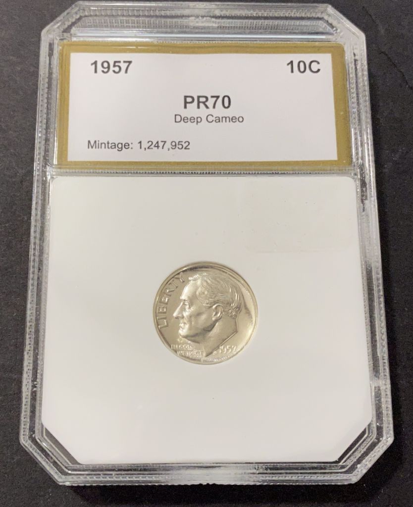 1957 Roosevelt Dime Proof 70, PCI, Deep Cameo, slabbed. 1957 Roosevelt Dime Proof 70, PCI, Deep Cameo, slabbed.