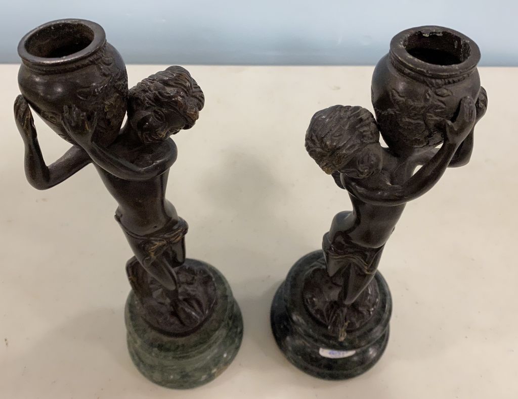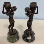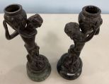 Pair of Bronze Like Cherub Candle Holders, dark patina, marble bases, 10"h. Pair of Bronze Like Cherub Candle Holders, dark patina, marble bases, 10"h.