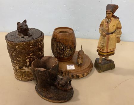 Wood Carved Accessories, wood carved figure 9"h., wolf carved container. Wood Carved Accessories, wood carved figure 9"h., wolf carved container.