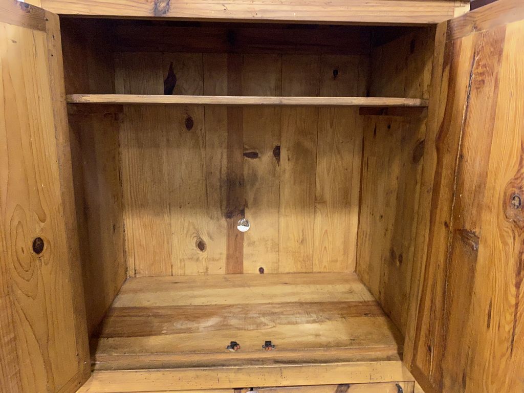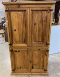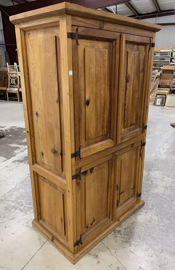 Heavy Pine Entertainment Cabinet, quad door, missing front knob, one piece, heavy, 72"h., 39"w., 17"d. Heavy Pine Entertainment Cabinet, quad door, missing front knob, one piece, heavy, 72"h., 39"w., 17"d.