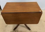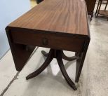 Duncan Phyfe Drop Leaf Table, pedestal base with four legs brass paw, single drawer, 29"h., 46"w. Duncan Phyfe Drop Leaf Table, pedestal base with four legs brass paw, single drawer, 29"h., 46"w.