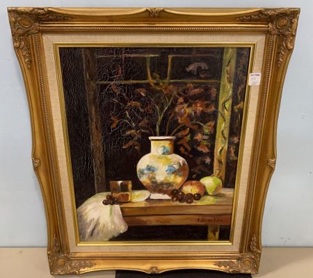 Peggy Bracken Still Life Oil Painting, Flower bouquet, Mississippi Artist, some age crackle, gold gilt framed, 25"h., 21"w. Peggy Bracken Still Life Oil Painting, Flower bouquet, Mississippi Artist, some age crackle, gold gilt framed, 25"h., 21"w.