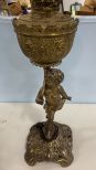 AntiqueBrass Figural (boy) oil lamp, converted electrified, milk glass shade with hurricane shade, 32"h. AntiqueBrass Figural (boy) oil lamp, converted electrified, milk glass shade with hurricane shade, 32"h.